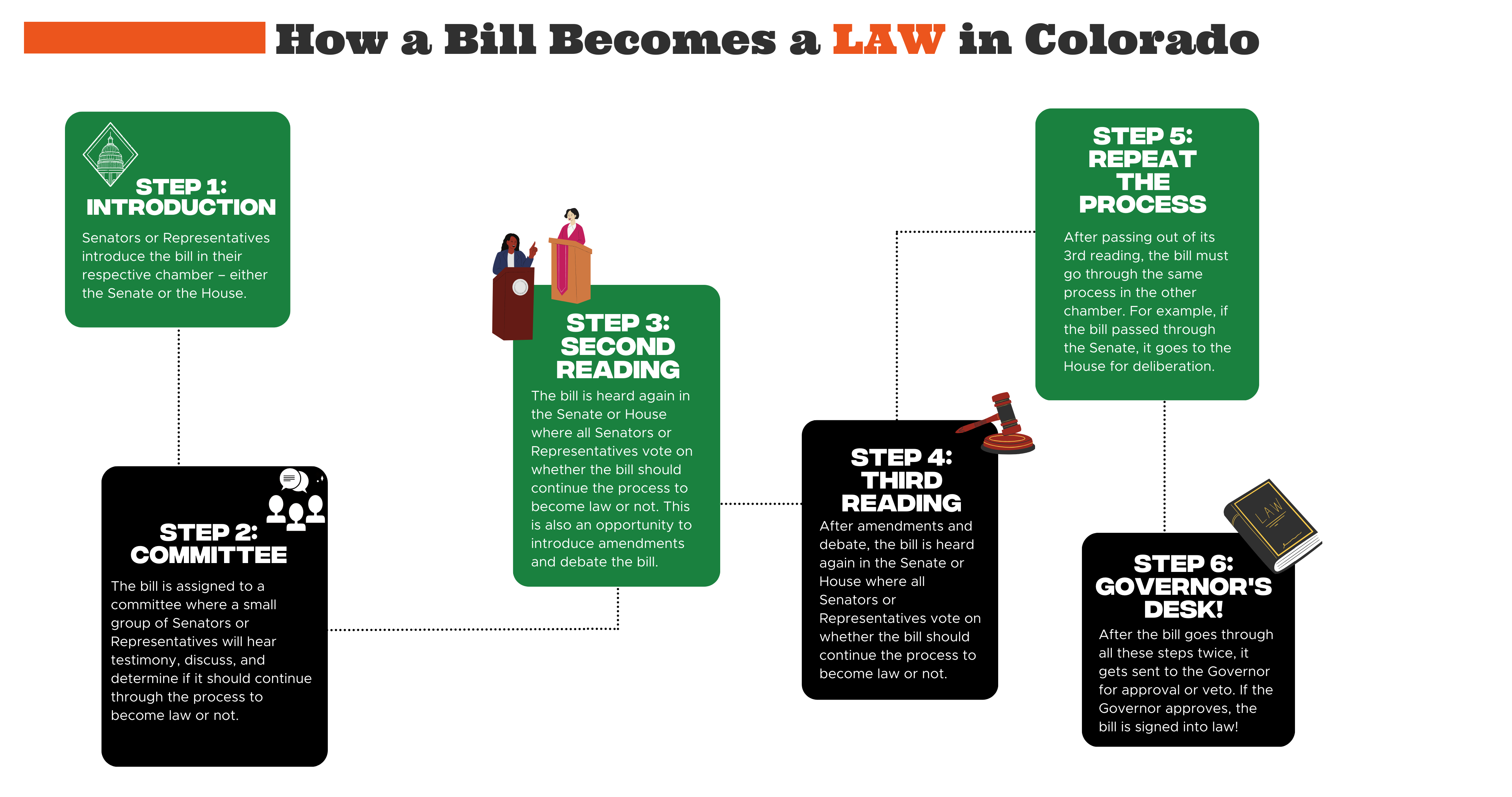While we do our best to explain the issues we engage with in a detailed manner, all details may not be included here. If you would like to learn more about the Colorado legislature, bills that are mentioned in this guide or other bills not included in this guide, you can do so by visiting the general assembly website.